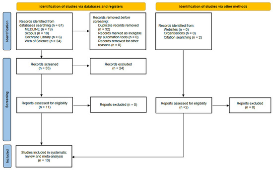 A total of 67 records were identified through database searches (Figure 1). After duplicates were removed, 35 records were left for further evaluation. Screening based on titles and abstracts resulted in the exclusion of 24 publications as they did not align with the specific objectives of this review. Finally, 13 studies were included in the systematic review and meta-analysis.