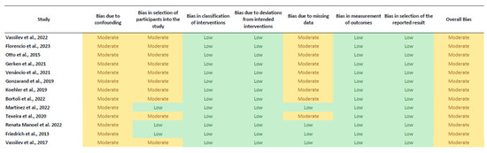 The risk of bias assessment for the non-randomized studies was conducted using the ROBINS-I tool. The predominant risk of bias among the studies was moderate, primarily due to the inherent challenges in addressing confounding variables. Studies such as those by Vassilev et al. [18], Florencio et al. [19], Otto et al. [20], Gerken et al. [21], Venancio et al. [23], Vassilev et al. [22], Golzarand et al. [24], Koehler et al. [25], Bortoli et al. [26], and Teixeira et al. [28] exhibited moderate risk primarily due to potential residual confounding. These studies often faced difficulties in fully controlling for all confounding factors, which could impact the observed outcomes. Confounding variables, such as baseline health status, socio-economic factors, and pre-existing conditions, were not always adequately accounted for, potentially leading to biased effect estimates.