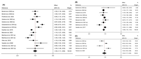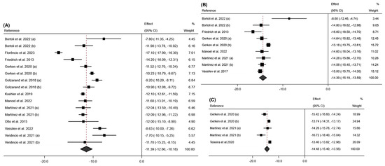 Forest plot detailing the effect size and 95% confidence intervals (CI) for the effect of surgical intervention on PhA at (A) 6 months post-intervention; (B) 12 months post-intervention; (C) 24 months post-intervention. (a) Sleeve Gastrectomy; (b) Roux-en-Y Gastric Bypass [18,19,20,21,22,23,24,25,26,27,28,29].