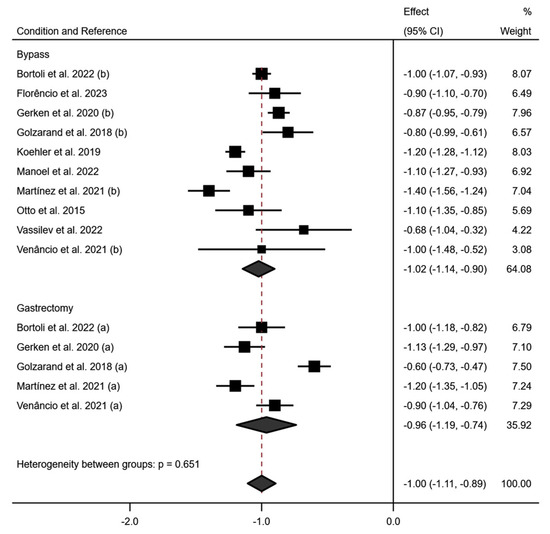Figure 4 shows the subgroup analysis according to the surgical technique used for PhA at 6 months. Specifically, this analysis showed a variation in the decrease in PhA according to the type of technique used, with a greater decrease in PhA in the RYGB technique (−1.02; 95% CI −1.14 to −0.90; p < 0.001) (I2 = 86.5%; p < 0.001) than in Gastrectomy (−0.96; 95% CI −1.19 to −0.74) (I2 = 91.5%; p < 0.001) at 6 months postoperatively.