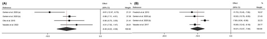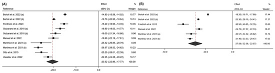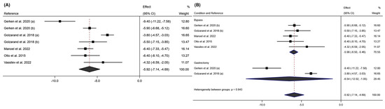 Forest plot detailing the effect size and 95% confidence intervals (CI) for the effect of surgical intervention on fat mass at (A) 6 months post-intervention; (B) 12 months post-intervention. (a) Sleeve Gastrectomy; (b) Roux-en-Y Gastric Bypass [18,19,20,22,23,24,26,27,29].