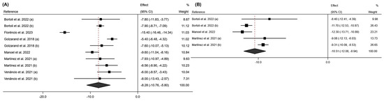 These results are consistent with those observed in the LBM variable (Figure 7). After 6 months of intervention, an average effect of −6.40 was observed for this variable (95% CI: −8.22 to −4.58; p < 0.001; I2 = 56.9%; 95% CI: 0.0% to 86.6%; p = 0.073). At 12 months post-intervention, a further decrease in this variable was observed, with an average effect of −10.01 (95% CI: −12.07 to −7.94; p < 0.001; I2 = 74.2%; 95% CI: 0.0% to 92.5%; p < 0.009).