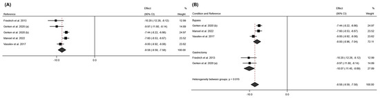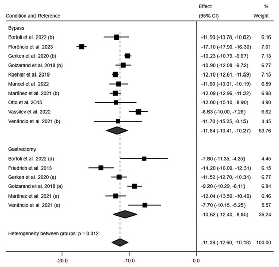 The meta-analysis of the BCM variable showed that bariatric surgery significantly influences this variable, with an average effect size at six months post-surgery of −5.92; 95% CI: −7.14 to −4.69 (p < 0.001; I2 = 86.1%; 95% CI: 0.0% to 94.91%; p < 0.001). According to the surgical intervention performed, it was observed that the SG intervention reduced this variable more significantly than RYGB (SG: effect size: −6.54; 95% CI: −12.02 to −1.05 (p < 0.020; I2 = 98.8%; p < 0.001); RYGB: effect size: −5.98; 95% CI: −6.50 to −5.46 (p < 0.001; I2 = 0.0%; p = 0.487)). These results can be seen in Figure 8.