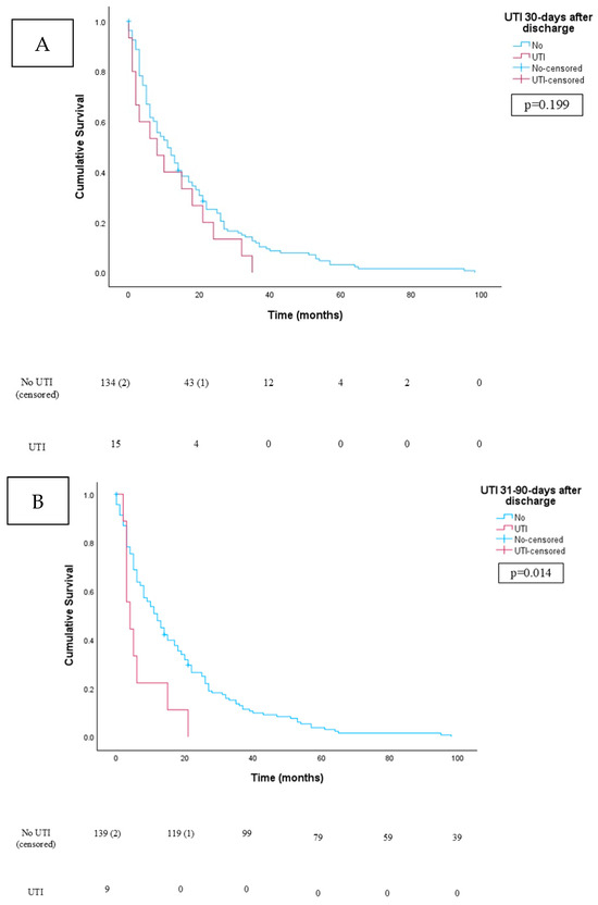 Kaplan-Meier survival curve. The following table represents a comparison of overall survival between patients who did and did not develop a UTI at both 30– (A) and 31–90 days (B) after discharge from radical cystectomy. Patients who formed a UTI are on the red line, and those who did not form a UTI are on the blue line. The number at risk table is also provided below with time in months. There was a statistically significant difference in overall survival, favoring patients who did not develop a UTI 31–90 days after discharge using the log-rank test (p = 0.014).