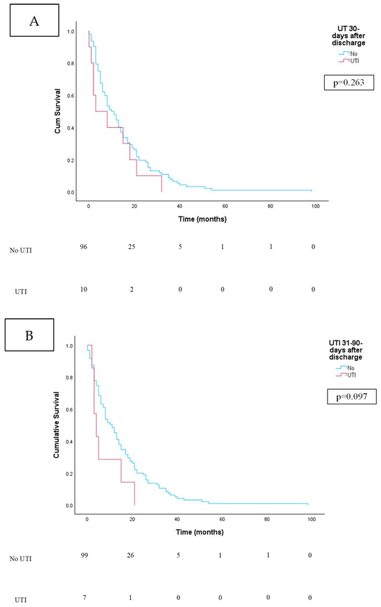 Mean age at surgery was similar between patients with (66.9 years) and without (66.5 years) a UTI 31–90 days after RC discharge (p = 0.891) (Table 1). No significant differences in gender, race, CCI, or diabetes were seen between those with and without a UTI (p > 0.05). Hypertension was significantly more prevalent in the stone-forming group (p = 0.030). Approach (p = 0.082) and concomitant nephroureterectomy (p = 0.386) did not differ significantly in those with and without a UTI 31–90 days from discharge. Bowel resection during RC was more likely to be performed in patients who developed a UTI 31–90 days after RC (p = 0.030). Twenty-one (84%) patients were febrile at presentation. Urosepsis was seen in three (12%) patients. The most common pathogens in urine culture were E. coli (N = 5) and Klebsiella pneumoniae (N = 5), followed by Pseudomonas (N = 3), Enterobacter cloacae (N = 3), and Enterococcus faecalis (N = 3). Patients who developed a UTI 31–90 days after RC were more likely to have a cutaneous ureterostomy diversion (p = 0.001). For those with an ileal conduit, UTI was more common in those with a Wallace than Bricker ureteral anastomosis (p = 0.033). Tumor pathology (p = 0.162), incidence of death (p = 0.511), incidence of cancer-specific death (p = 0.881), and cancer-specific survival (p = 0.203) were similar. Overall survival was worse in patients who developed a UTI in this time frame (p = 0.001). On survival analysis, overall survival was worse in those patients who developed a UTI 31–90 days from discharge (Figure 1B; p = 0.014). On survival analysis, cancer-specific survival was not different in those patients who did and did not develop a UTI 31–90 days from discharge (Figure 2B; p = 0.097).