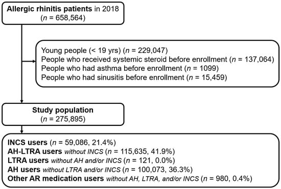 Among the AR patients in 2018 (n = 658,564), we excluded individuals younger than 19 years old (n = 229,047), who received systemic steroids before enrollment (n = 137,064), and who had asthma (n = 1099) or rhinosinusitis (n = 15,459) before enrollment (“before enrollment” means from 1 January 2017 to 31 December 2017). We enrolled 175,895 AR patients and classified them into five groups: INCS users (n = 59,086; 21.4%), AH with LTRA (AH-LTRA) users without INCS (n = 115,635; 41.9%), LTRA users without AH and/or INCS (n = 121; 0.0%), AH users without LTRA and/or INCS (n = 100,073; 36.3%), and other AR medication users including intranasal AH and/or decongestant without AH, LTRA, and/or INCS (n = 980; 0.4%) (Figure 1).