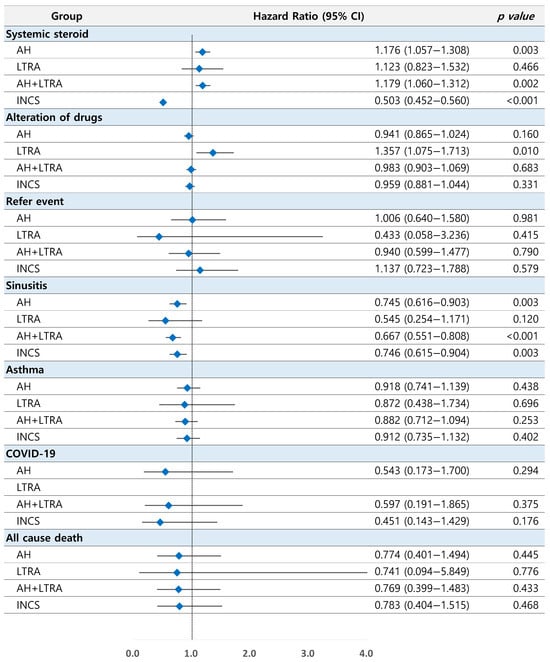 Forest plot for clinical outcomes compared to other AR medication group. AH, antihistamine; LTRA, leukotriene receptor antagonist; COVID-19, coronavirus disease; INCS, intranasal corticosteroid. Blue rectangles and the lines present hazard ratio and 95% CI.