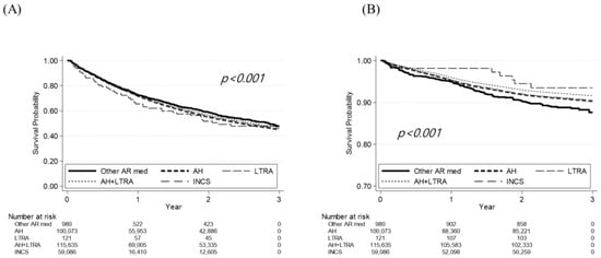 Allergic rhinitis (AR) is a relatively common disease, with a prevalence of 25% worldwide. Its symptoms include rhinorrhea, sneezing, nasal congestion, and pruritis. AR patients whose disease is not well controlled may experience tiredness, fatigue, sleep disturbance, and impaired quality of life []. Pharmacotherapy is frequently needed to control AR, and the recent worldwide guidelines [,]. recommend three drug categories to control AR symptoms: intranasal corticosteroids (INCSs), antihistamines (AHs), and leukotriene receptor antagonists (LTRAs). INCSs inhibit the influx of inflammatory cells and result in an improvement of inflammation, whereas AH helps reduce the hyperreactivity of the airways and increase the motility of epithelial cilia. LTRAs also reduce inflammation by inhibiting the leukotriene-related pathway’s effect on inflammatory cytokine cascades [,]. However, whether these drugs can also affect clinical outcomes remains unknown. In addition, there are few studies comparing the effects of AR medication on clinical prognosis [].