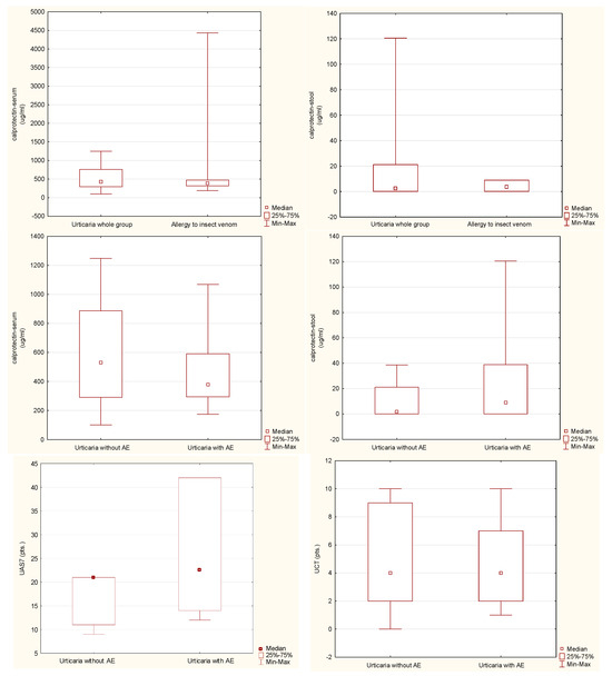 Serum and fecal calprotectin concentrations in the group of patients with chronic spontaneous urticaria with and without angioedema (AE, angioedema; UAS7, Urticaria Activity Score 7-day assessment; UCT, Urticaria Control Test; min, minimum; max, maximum; p, probability level).