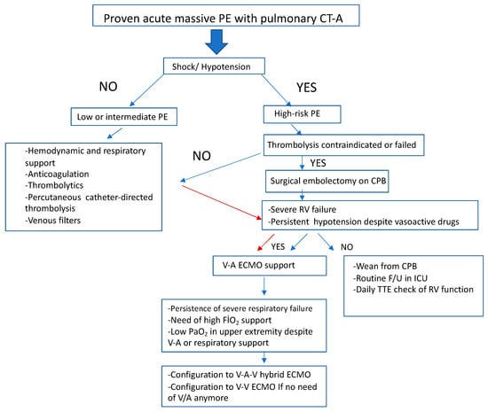 A gap still exists in the decision-making process and implementation of surgical pulmonary embolectomy, which is considered a last resort due to its invasiveness and associated risks. Additionally, the optimal timing for the use of peripheral extracorporeal membrane oxygenation (ECMO) in high-risk massive pulmonary embolism (aPE) patients is still not well defined, even though other treatment modalities are clearly outlined in the 2014 ESC guidelines for the diagnosis and management of acute pulmonary embolism [