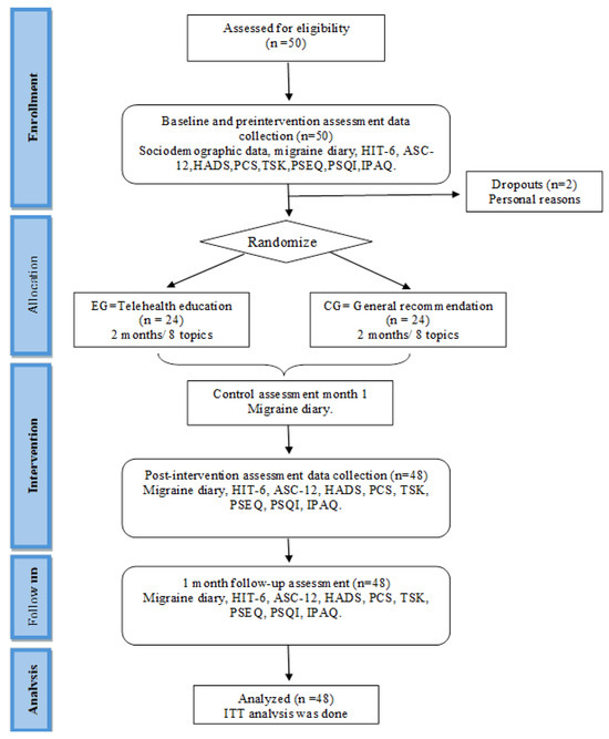 A randomized, double-blind, controlled pilot study with two parallel groups was conducted. All patients received the standard treatment, which consisted of an onabotulinumtoxinA (BTX-A) injection. The patients only received BTX-A during the study period. When necessary, they used NSAIDs, triptans, or a combination of NSAIDs as rescue treatments. Both the intervention and control groups received identical study actions, with the only difference being the specific intervention applied to the treatment group. This ensured that any differences in outcomes were attributable to the intervention itself. Patients in the experimental group (EG) received an asynchronous TTEP, whereas those in the control group (CG) received a program with general educational health recommendations. The effects were compared within and between the groups.