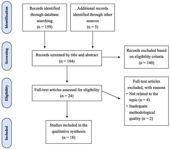 The flowchart of the study selection process is reported in Figure 2. The electronic search resulted in the identification of 159 studies and 5 additional articles from Gray Literature. Notably, in this initial stage, articles reporting both P. gingivalis and A. actinomycetemcomitans were searched. During the first phase, 140 articles were excluded after reading their titles and abstracts, leaving 24 articles to be fully analyzed. After full-text reading, 6 more articles were excluded, 2 of them for inadequate methodological quality and 4 studies for not being entirely related to the theme. A total of 18 studies were included in the review.