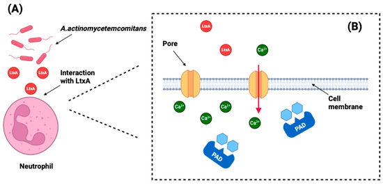 Schematic representation of the citrullination pathway induced by Aggregatibacter actinomycetemcomitans (A. actinomycetemcomitans). (A) A. actinomycetemcomitans secretes leukotoxin A (LtxA), which targets and interacts with neutrophils. (B) LtxA forms pores in the neutrophil membrane, disrupting intracellular calcium homeostasis. This abnormal calcium influx hyperstimulates the host’s peptidylarginine deiminase (PAD) enzymes, leading to increased citrullination of proteins. Original figure created using BioRender©.