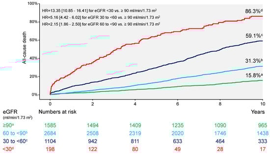 Ten-year incidence of all-cause mortality. eGFR = estimated glomerular filtration rate; HR = hazard ratio.