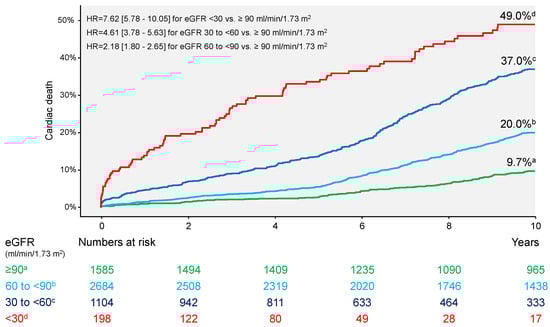 Ten-year incidence of cardiac mortality. eGFR = estimated glomerular filtration rate; HR = hazard ratio.