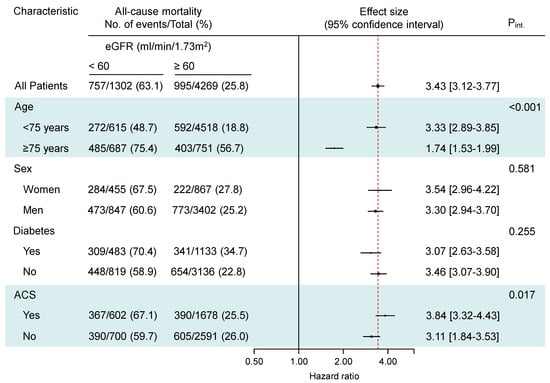 There were eGFR-by-age and eGFR-by-clinical presentation interactions showing a stronger association of reduced eGFR with the risk for all-cause and cardiac mortality in patients younger than 75 years (Pint < 0.001 for both all-cause and cardiac mortality) and patients presenting with an ACS (Pint = 0.017 for all-cause mortality and Pint = 0.026 for cardiac mortality; Figure 3 and Figure 4). The association of reduced eGFR with the risk of noncardiac mortality and myocardial infarction was also stronger in patients < 75 years of age (Pint < 0.001 for noncardiac mortality and Pint = 0.022 for myocardial infarction; Figures S7 and S8). The association of reduced eGFR with the risk of stent thrombosis was stronger in women with reduced eGFR compared with men (Pint = 0.012; Figure S9). There were no significant interactions between eGFR and age, sex, diabetic status or clinical presentation with respect to the risk for TLR (Pint > 0.547 for all interactions), TVR (Pint > 0.371 for all interactions) and NonTVR (Pint > 0.100 for all interactions).