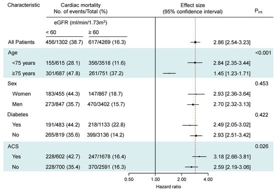 Cardiac mortality in subgroups of patients according to age, sex, diabetic status and clinical presentation. ACS = acute coronary syndrome; Pint = P for interaction. The highlights show significant interactions.