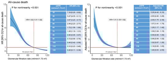 The unadjusted and adjusted restricted cubic spline regression analysis showed a nonlinear association between eGFR and all-cause, cardiac and noncardiac mortality (p for nonlinearity < 0.001 for all three relationships). In unadjusted analysis, for eGFR values <78 mL/min/1.73 m2, the association of eGFR and all-cause, cardiac and noncardiac mortality was significant. In adjusted analysis, eGFR values <77 mL/min/1.73 m2, <78 mL/min/1.73 m2 and <70 mL/min/1.73 m2 were significantly associated with higher risk of all-cause, cardiac and noncardiac mortality, respectively (Figure 5, Figure 6 and Figure S10).