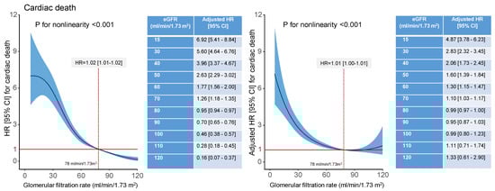 Unadjusted (left panel) and adjusted (right panel; the list of variables is shown in the Methods) association between glomerular filtration rate (GFR) and cardiac mortality. The spline curves show the association between GFR values up to 120 mL/min/1.73 m2 and cardiac mortality at 10 years. The inserted tables on the right side of each graph show unadjusted (left panel) and adjusted (right panel) hazard ratios for cardiac mortality for GFR values between 15 and 120 mL/min/1.73 m2. For GFR values lower than 78 mL/min/1.73 m2 the association between GFR and 10-year cardiac mortality was significant in unadjusted and adjusted analysis. CI = confidence interval; eGFR = estimated glomerular filtration rate; HR = hazard ratio.
