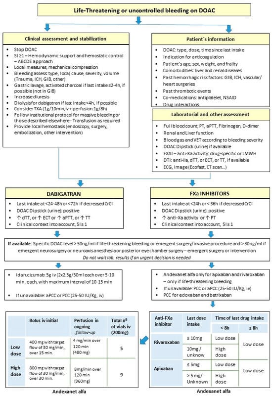 - Al Aseri, Z.; AlGahtani, F.H.; Bakheet, M.F.; Al-Jedai, A.H.; Almubrik, S. Evidence-Based Management of Major Bleeding in Patients Receiving Direct Oral Anticoagulants: An Updated Narrative Review on the Role of Specific Reversal Agents. J. Cardiovasc. Pharmacol. Ther. 2023, 28, 10742484231202655. [Google Scholar] [CrossRef]