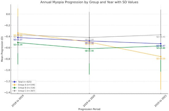 This graph illustrates the annual myopia progression from 2018 to 2021 across four age groups: patients aged ≤ 10 (Group A), 11–14 years (Group B), and ≥15 years (Group C), and the total sample. The data show that the youngest group (Group A) experienced a faster progression rate, especially during the 2020–2021 period. The SD (standard deviation) values, shown next to each point, reflect the variability in progression.