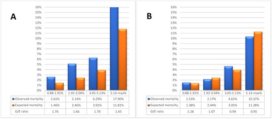 The estimated mortality rate was inaccurately low to varying degrees across different subgroups of the overall population. Knapik et al. and Boracci et al., divided the research cohort into quartiles and analyzed the observed-to-expected (O/E) ratio for each group [2,7]. This same methodology for mortality assessment was adopted in this study. The findings indicate that, at lower EuroSCORE II ranges (0.5–1.82%), the risk was underestimated, while accuracy improved at higher ranges (Figure 2). In the OPCAB, the risk was overestimated at higher EuroSCORE II ranges (4.82–68.33%), reaching an O/E ratio of 0.95. This divergence was not due to the proportion of missing data, as this percentage was consistent across all quartiles.