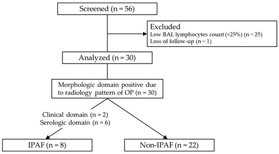 Flow chart of the study. Of the 56 patients, 30 with cryptogenic organizing pneumonia were analyzed. Abbreviations: BAL, bronchoalveolar lavage; OP, organizing pneumonia; IPAF, interstitial pneumonia with autoimmune features.