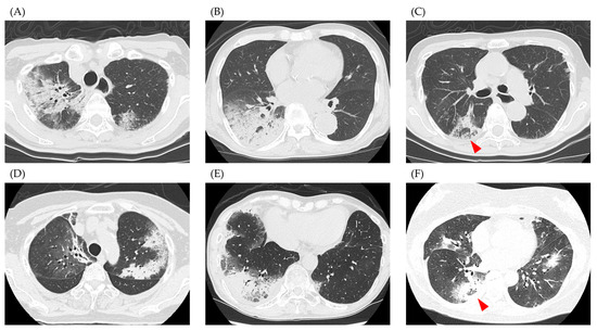 Representative CT images of the study participants are shown in Figure 2. Figure 2A–C show cases from the IPAF group and Figure 2D–F show cases from the non-IPAF group. Figure 2A,B,D,E show consolidation with a peripheral predominance. The red arrowheads in Figure 2C,F indicate the reversed halo sign. Table 2 shows the results of the central review of CT patterns for both groups. Bilateral and peripherally dominant consolidations were the major patterns observed in our study. A reversed halo sign was observed in four patients. There were no significant differences in the distribution or opacity patterns on CT between the IPAF and non-IPAF groups.