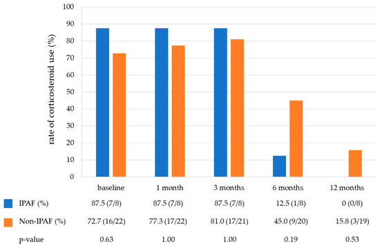 The rate of corticosteroid use in the IPAF group and non-IPAF group during a one-year follow-up period. Abbreviations: IPAF, interstitial pneumonia with autoimmune features.