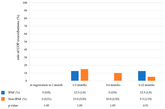 Table 3 shows the treatment of the COP. Notably, 76.7% of patients (23/30) were treated with corticosteroids, and the starting dose was similar between the two groups (25 mg/day vs. 30 mg/day). None of the patients received immunosuppressive drugs. Figure 3 shows the rate of corticosteroid use in the IPAF and non-IPAF groups during a one-year follow-up period. The rate of corticosteroid tapering was similar between the IPAF and non-IPAF groups. At 12 months, 0% and 15.8% of patients in the IPAF and non-IPAF groups were receiving corticosteroid therapy, respectively, and six patients never received corticosteroids during the observational period (IPAF group, one; non-IPAF group, five). A small number of cases in both groups developed COP exacerbation during the one-year follow-up period. The frequency of COP exacerbation did not differ between the IPAF and non-IPAF groups (Figure 4).