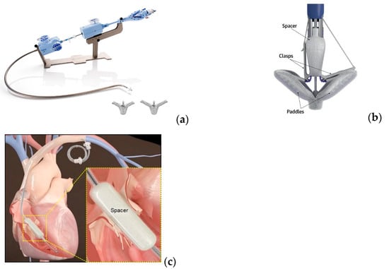 Figure 1. (a) TriClip-delivery system and clips, Abbott [12]; (b) Pascal device, Edwards Lifesciences [13]; (c) Forma device, Edwards Lifesciences [14].