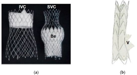 The proximal part of the IVC prosthesis should penetrate 5–12 mm into the RA. The first 20 mm have a skirt and contain the valve. The skirt reduces the paravalvular leaks. The covered portion is short so as not to occlude hepatic vein drainage. A distance of at least 5–15 mm between the hepatic vein drainage and the RA is recommended. The prosthesis has high radial force in the area containing the valve to fix to the vein wall and to reduce the risk of valve deformation. The other parts of the prosthesis have low radial force and a large diameter to facilitate fixation without traumatizing the vein wall. When choosing the size of the prostheses, it is necessary to oversize by 10–40% (in the belly part for the SVC and in the proximal part for the IVC prosthesis) compared to the vein size at CT scan. Initially, TricValve could only be used for vena cava diameters below 35 mm; later, larger prostheses became available [35]. TricValve and similar valves are shown in Figure 4.