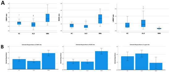 (A): Group comparisons were implemented using the Kruskal–Wallis test. The CMAP ratio was significantly higher in SMA patients than in controls (p = 0.017) and ALS patients (p < 0.001), and it was lower in ALS patients than in controls (p = 0.014). The MUNE ratio was higher in SMA patients than in both ALS patients and controls (p < 0.001), and it was lower in ALS patients than in controls (p = 0.047). (B): General linear models adjusted for age. The CMAP ratio was significantly higher in SMA patients than in ALS patients and healthy controls (p < 0.001), but it was not significantly different between ALS patients and controls (p = 0.199). The MUNE ratio was significantly higher in SMA patients than in ALS patients and controls (p < 0.001), while it was not different between ALS patients and controls (p = 0.89). The LSMUP ratio was significantly lower in SMA patients than in ALS patients (p = 0.014) and showed a trend toward significance compared to controls (p = 0.05) (B).