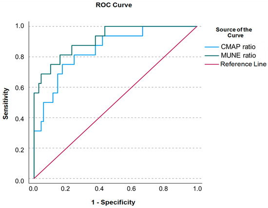 ROC curve analysis was conducted to determine the area under the curve (AUC) and cut-off values for both CMAP and MUNE ratios for distinguishing between ALS and SMA patients. We found that the AUC for the CMAP ratio was 0.871 (95% CI: 0.779–0.963), with a sensitivity of 93.8%, a specificity of 69.6%, and a cut-off of 0.79 (p < 0.001). The MUNE ratio showed a better performance, with an AUC of 0.931 (95% CI: 0.867–0.995), a sensitivity of 93.8%, a specificity of 71.7%, and a cut-off of 0.69 (p < 0.001) (Figure 2).