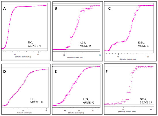 MUNE values of the APB muscle in a healthy control (A), an ALS patient (B), and a SMA subject (C). MUNE values of the ADM muscle in a healthy control (D), an ALS patient (E), and a SMA subject (F). On the horizontal axis, the stimulus current (mA) is displayed; on the vertical axis, the CMAP amplitude (mV) is displayed. Note the reverse pattern in the SMA patient, with MUNE 63 in the APB vs. MUNE 15 in the ADM muscle.