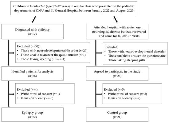 Patient flow diagram. Of the 67 children diagnosed with epilepsy, 35 in total were excluded, leaving 32 children in the epilepsy group. Of the 26 children eligible for inclusion in the control group, 5 were excluded, leaving 21 children in the control group. OMU, Osaka Metropolitan University Hospital.