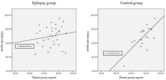 Self-reported and proxy-reported total Kid-KINDL-R scores were correlated in the control group (ρ = 0.656, p = 0.001), but not in the epilepsy group (ρ = 0.171, p = 0.348; Table 4; Figure 2). In terms of subscales, significant correlations were observed between self-reported and proxy-reported scores only for the “Social” subscale in the epilepsy group, and in the “Family” and “School” subscales in the control group.