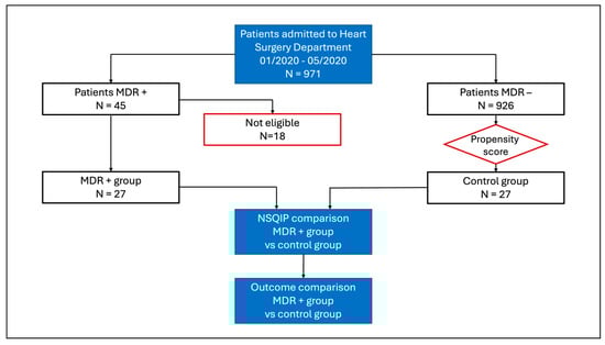 Considering the 27 patients in the MDR+ group eligible for the study, the control group of 926 patients underwent propensity score matching to produce a comparable group of 27 patients per group.