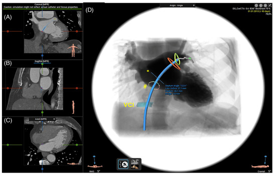 Furthermore, to reduce the risk of device tilting or peri-device leakage (PDL) and to limit the need for catheter exchanges, it is crucial to select a puncture site that enables a straight trajectory along the LAA’s long axis, perpendicular to the ostium. Cardiac CT and dedicated post-processing software can be used to guide the interventionalist by simulating the optimal septal puncture site, guidewire, and device catheter trajectory to enable interactive rehearsals of the LAAO procedure, enhancing procedural familiarity (Figure 6) [23,24].
