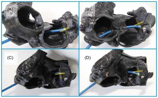 In vitro TSP simulation. LAA ostium and its axis are marked in yellow. (A,B) left anterior oblique (LAO) projection, (C,D) LAO with cranial angulation; (A,C) optimal sheath position (posterior TSP), (B,D) nonoptimal sheath position (anterior TSP). LAO, left anterior oblique; TSP, transseptal puncture. Adapted with permission from Hozman et al. [25].