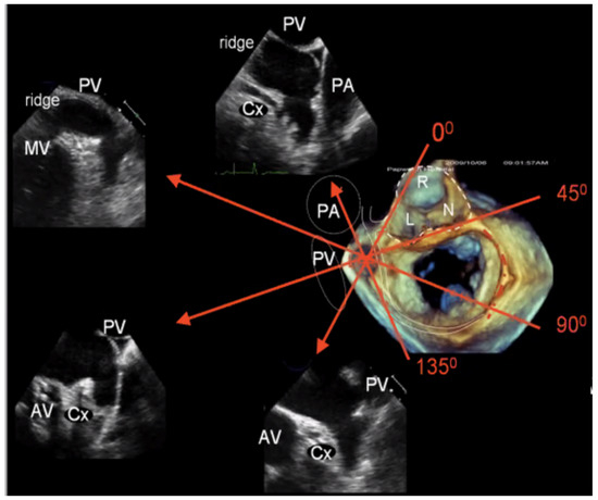 Conventional 2D transoesophageal echo view (0, 45, 90, and 135°) of the left atrial appendage and surrounding structures. AV: Aortic valve; MV: Mitral valve; PA: Pulmonary artery; PV: Pulmonary vein; Cx: Left circumflex artery.