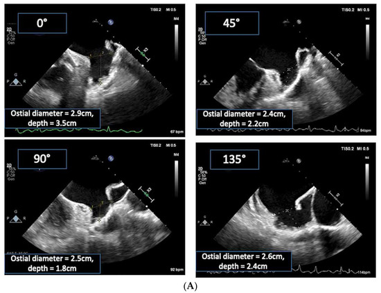 As with cardiac CT, TOE is able to directly assess the LAA’s ostial dimensions, the device landing zone’s dimensions, and the LAA’s length [26]. With 2D TOE, the recommended orthogonal views are 0°, 90°, 45°, and 135° to fully appreciate the shape and dimensions of the LAA (Figure 10). The LAA ostium is measured from the origin of the left circumflex artery to the tip of the coumadin ridge in multiple views. The landing zone for the device is assessed from the left circumflex artery to the roof of the LAA, leaving a minimum 10 mm gap (Figure 11A) [22,29]. However, despite obtaining these orthogonal views, 2D TOE may not fully appreciate the complex 3D shape and orientation of the LAA. Indeed, in a single-centre study of cardiac CT versus 2D TOE, using 2D TOE alone would have resulted in 62% of patients being undersized for their device [30].