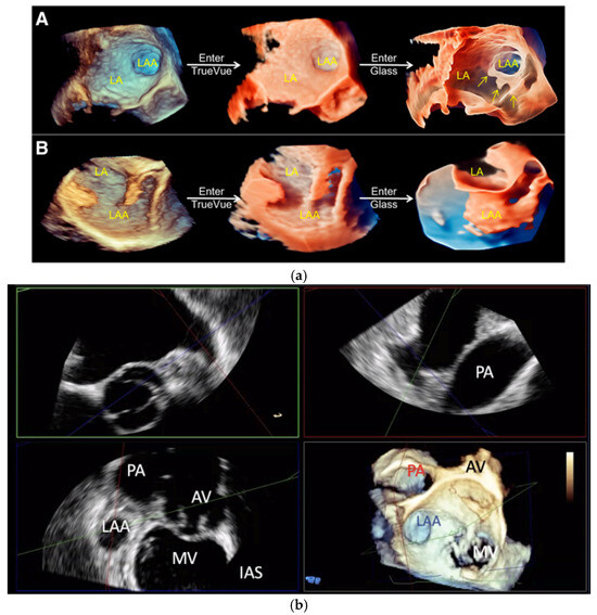 (a) Conversion of conventional real-time 3D transoesophageal echocardiography to TrueVue Glass. (A) From left to right, conventional 3D, TrueVue, and TrueVue Glass imaging modes of the LAA at the entrance of the left atrium are shown. The TrueVue Glass (right) shows the three lobular structures at the blind end of the LAA (arrows). (B) From left to right, conventional 3D, TrueVue, and TrueVue Glass imaging of the LAA in lateral view are shown. 3D: three-dimensional; LA: Left atrium; LAA: Left atrial appendage. Adapted with permission from Sun et al. [27]. (b) Three-dimensional (3D) multiplanar reformat images depicting the anatomical relationship of the LAA with the surrounding structures as seen with 3D TOE. AV: Aortic valve; MV: Mitral valve; PA: Pulmonary artery; LAA: Left atrial appendage; IAS: Inter-atrial septum; TOE: Transoesophageal echocardiogram.