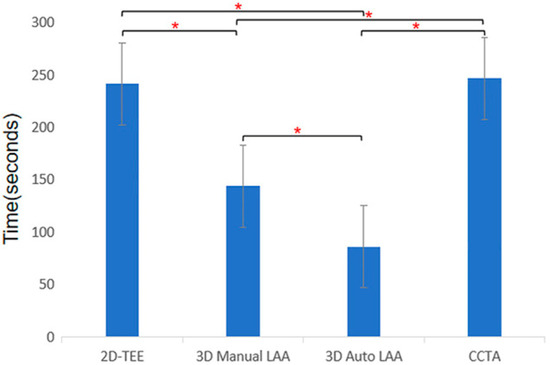 Time consumption of different methods for measuring morphological parameters of left atrial appendage. 2D-TEE, two-dimensional transoesophageal echocardiography; 3D Auto LAA, three-dimensional automated left atrial appendage; 3D Manual LAA, three-dimensional manual left atrial appendage; CCTA, cardiac computed tomographic angiography; * p-value < 0.05. Adapted with permission from Sun et al. [27].