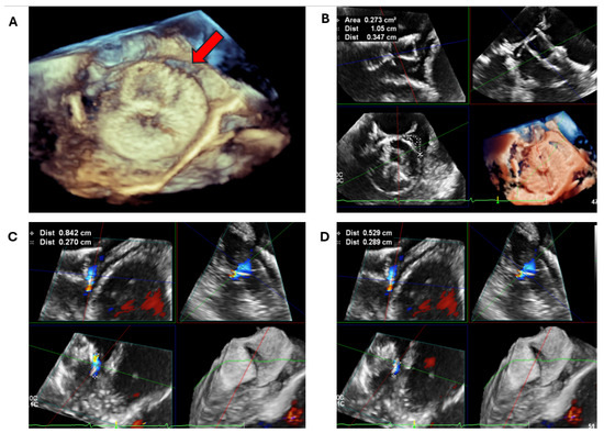 On TOE, a PDL is detected by measuring the width of the colour doppler jet on 2D planes (0, 45, 90, and 135°) or the full dimensions of the colour doppler on 3D imaging [44] (Figure 17). For this reason, the prevalence of PDL on TOE is significantly less than on CT [44]. However, a PDL detected on TOE (regardless of its size) is significantly associated with major adverse events (all-cause mortality and thromboembolism), with a graded positive association with increasing PDL size [44].