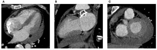 Additional contraindications, particularly for the insertion of hybrid endocardial–epicardial devices (such as the LARIAT system), include conditions such as pericarditis, pericardial adhesions, pectus excavatum, and a posteriorly rotated heart, with the LAA situated either behind the pulmonary trunk or next to a coronary bypass graft [16]. All of these conditions can be clearly identified through cardiac CT imaging prior to implantation (Figure 3) [16].
