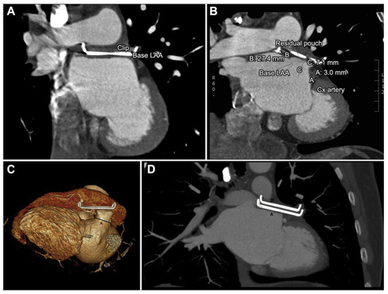 CT assessment of post-surgical LAA epicardial clip closure. (A) Example of optimal clip placement. (B) Residual left atrial appendage (LAA) pouch measurements after clip placement on the coronal sections. A indicates the base left atrial appendage (imaginary line); B indicates the circumflex (Cx) artery, 3 mm; and C indicates the residual pouch length, 7.1 mm in this illustration. (C) Example of a residual pouch of >10 mm. A indicates the position where the clip ideally should have been placed. (D) Example of the patient requiring a second clip. A and B are the 2 clips placed. Adapted with permission from Van Laar et al. [64].