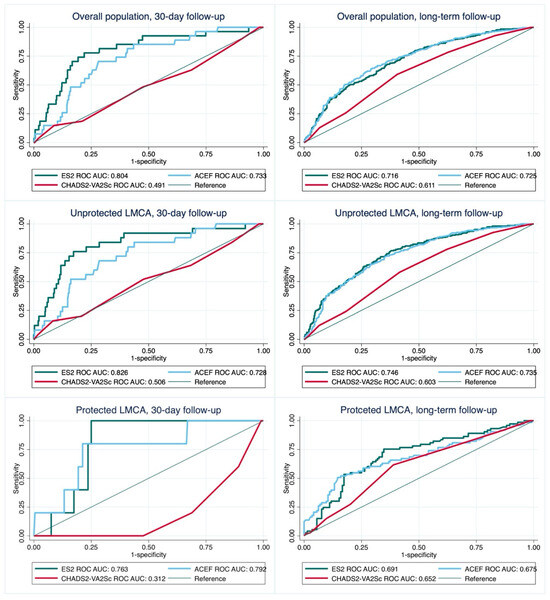 In the overall population and subgroup of patients with unprotected LM, Youden’s index analysis showed the best cut-off value for 30-day mortality prediction of ACEF at 1.99 and 1.65, EuroSCORE II at 7.1% in both subgroups, and CHA2DS2-VASc at 7 points in both subgroups. In the long-term follow-up, optimal cut points in overall population and unprotected LMCA population were defined as 1.68 and 1.57 for ACEF, 3.2% and 2.4% for EuroSCORE II, and 5 points for CHA2DS2-VASc in both subgroups.