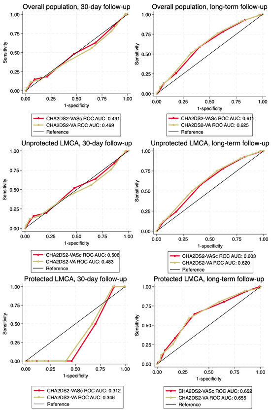 In patients with unprotected LMCA, EuroSCORE II showed better discriminative performance than ACEF and CHA2DS2-VASc in short-term (p = 0.051 and p < 0.001), while in the long-term, EuroSCORE II and ACEF were better than CHA2DS2-VASc (p < 0.001 for both two model comparisons). In the subgroup of post-CABG patients, EuroSCORE II and ACEF provided moderate 30-day mortality discriminative performance, as opposed to poor CHA2DS2-VASc discrimination. In the long-term, all of the analyzed CPMs provided acceptable discriminative performance. There were no significant differences between CHA2DS2-VASc and CHA2DS2-VA in the short-term (p = 0.24), while in the long-term, CHA2DS2-VA showed better performance (p = 0.02). Detailed information on the analyses are presented in Figure 2 and Figure 3 and Table 2.