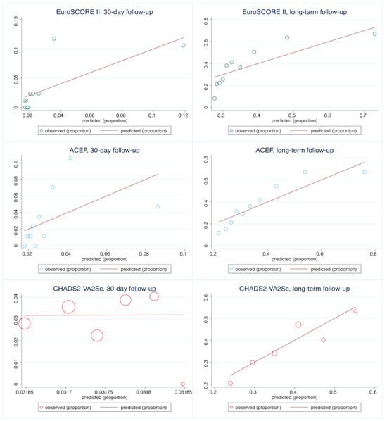 Predictive value of EuroSCORE II, CHA2DS2-VASc, and ACEF score on all-cause mortality was assessed with receiver operating characteristic (ROC) curves analysis by computing the area under the curve (AUC). Calibration of models was appraised by Hosmer–Lemeshow test and calibration plot methodology (predicted probability of the observed (O) vs. expected (E) proportion).